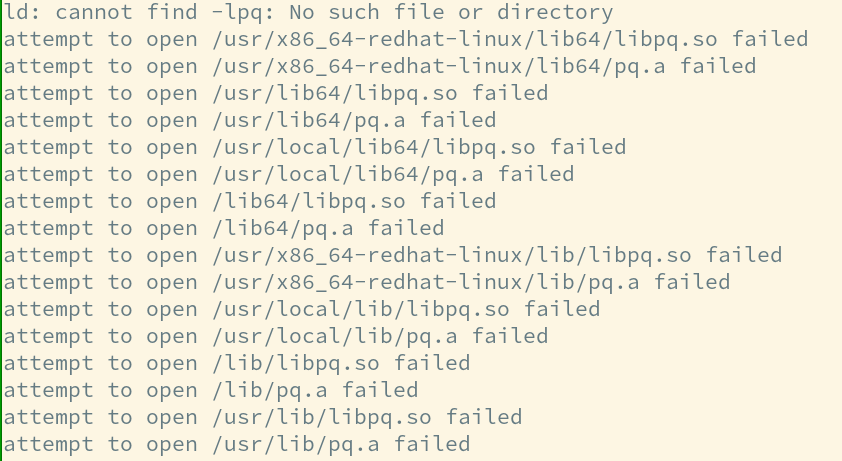 (可以发现,在所有可能的目录均宣告失败之后,ld 即反馈:ld: cannot find -lpq: No such file or directory 错误)