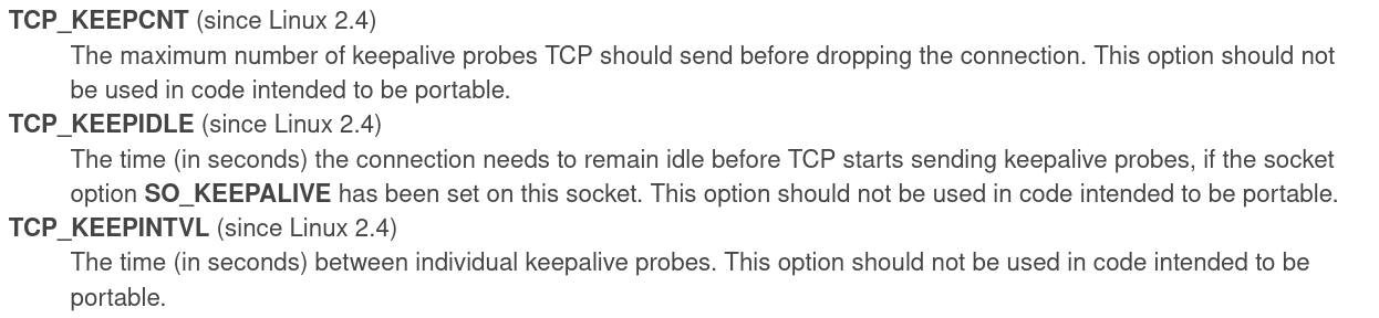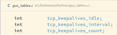 这个函数是一个 Linux 系统平台的 API 函数,可以用来设置连接的有关内容,在文档 https://linux.die.net/man/3/setsockopt 中,我们可以看到 SO_KEEPALIVE 选项,它可以使得连接启动周期性的数据包确认连接畅通机制(Keep-Alive),同时下面的三个参数,则分别对应 PostgreSQL 上面的三个内容(请参考 https://linux.die.net/man/7/tcp):