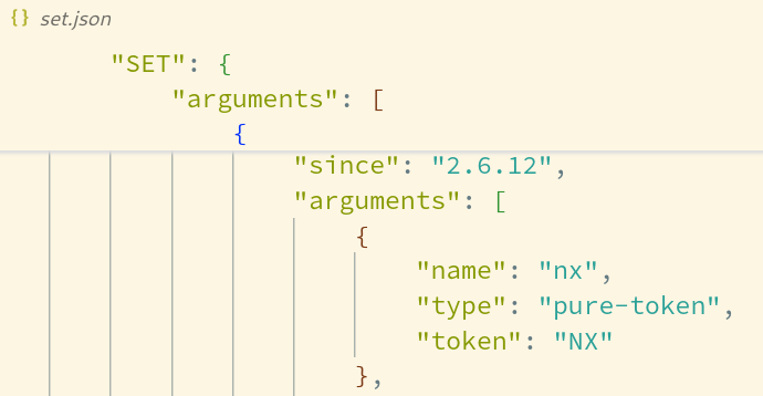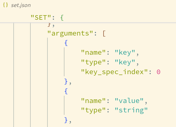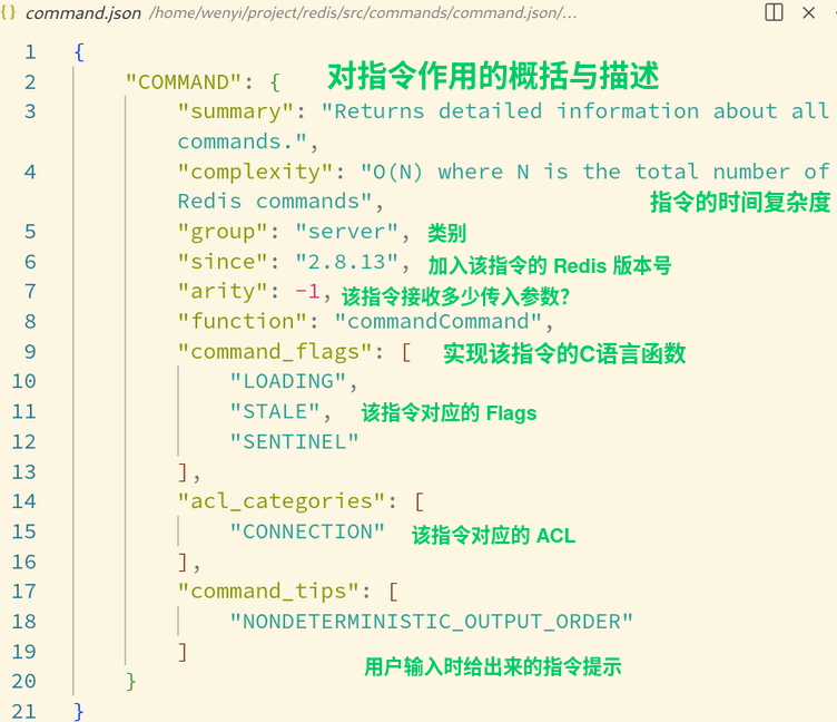 这些 Json 文件被用于生成 commnads.def 文件,它的组织形式就类似于直接使用 COMMAND 来输出的结果,但是因为一些域以及标志位是隐式填入,因此我们并不能依靠这些原始文件,来推导最终的输出结果(译者注:这就像 PostgreSQL 输出信息所使用的语言,往往需要结合具体的场景加以分析一样)。