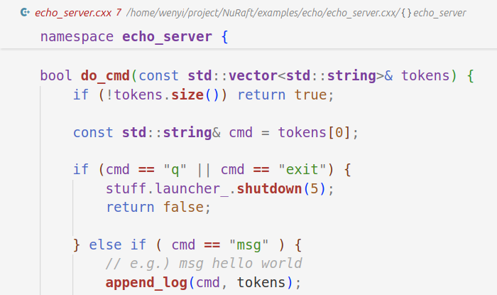 (echo 是 NuRaft 附带的一个示例小程序,用于展现如何使用 NuRaft 搭建分布式集群,如何设计节点间日志的数据格式,如何为程序设计配套指令,并对外交互,且与其它的节点展开信息同步)